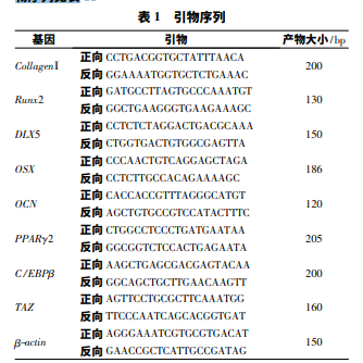 經(jīng)典 TRIzol 提取總 RNA,檢測濃度、 提純、逆轉(zhuǎn)錄,rRT-qPCR 采用一步法,按照說明書進(jìn)行操 作,2-△△Ct 法分析各基因表達(dá)差異。然后,應(yīng)用 Invitrogen 在線 引 物 設(shè) 計 軟 件 OligoPer-fectTM Designer 設(shè) 計,采 用 BLAST 進(jìn)行比對,探針序列由美國 Invitrogen 公司合成,根 據(jù) NCBI 數(shù)據(jù)庫序列設(shè)計 ( CollagenΙ ID 100199754,Runx2 ID 12393,DLX5 ID 13395,OSX ID 170574,OCN ID 632, PPARγ2 ID 19016,C/EBPβ ID 12608,TAZ ID 66826) ,引 物序列見表 1。